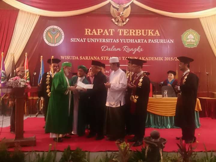 Portalarjuna.net-Syekh sayyid Prof. Dr. Muhammad Fadhil Al Jaelani Al Hasani, mengijazahkan kitab tafsir Al-Quran 30 juz karya Syekh Abdul Qadir Al-Jailani secara khusus kepada Pengasuh pondok Pesantren Ngalah, KH. Sholeh Bahruddin beserta seluruh audiens yang hadir dalam acara rapat terbuka Senat Universitas Yudharta sabtu 22/12/2016.