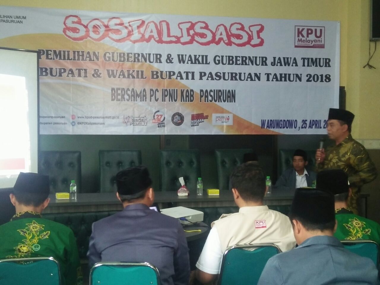 Portalarjuna.net-Dalam upaya meningkatkan partisipasi pemilih pemula dalam pesta demokrasi 27 Juni 2018 mendatang, KPUD Kab. Pasuruan terus melakukan sosialisasi, termasuk pagi tadi (26/04/2018) Anggota Komisioner KPUD Kab. Pasuruan Azmi Abbas melakukan sosialisasi kepada Pengurus IPNU Kab. Pasuruan di Gedung PCNU Kab. Pasuruan