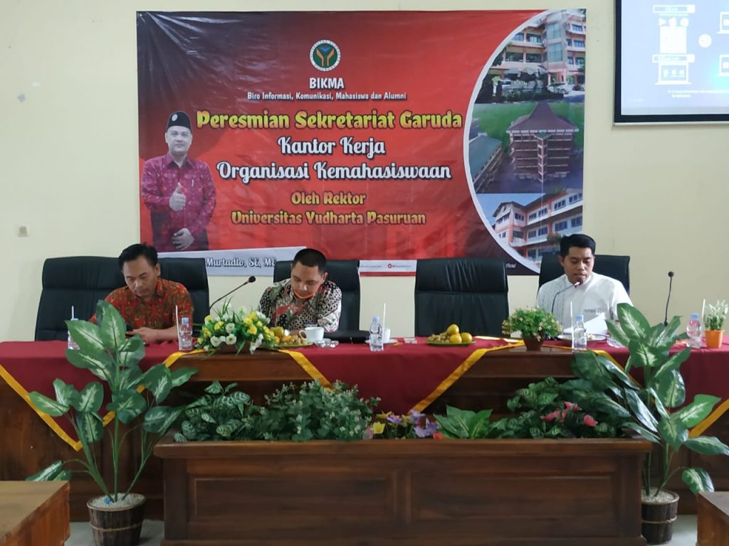 PortalArjuna.Net-Pasuruan, peresmian Sekretariat Garuda, untuk kantor kerja Organisasi kemahasiswaan, dilaksanakan pada Jumat (11/12), di Hallmeet Gedung Nusantara lantai 3, diresmikan secara langsung oleh Rektor Universitas Yudharta Pasuruan Dr. H. Kholid Murtadho, S.E., M.E . Dalam peresmiannya Kepala BIKMA Muhammad Nizar, M.EI, menyampaikan harapan kepada seluruh organisasi terkait untuk memanfaatkan, menjaga dan merawat fasilitas yang sudah […]