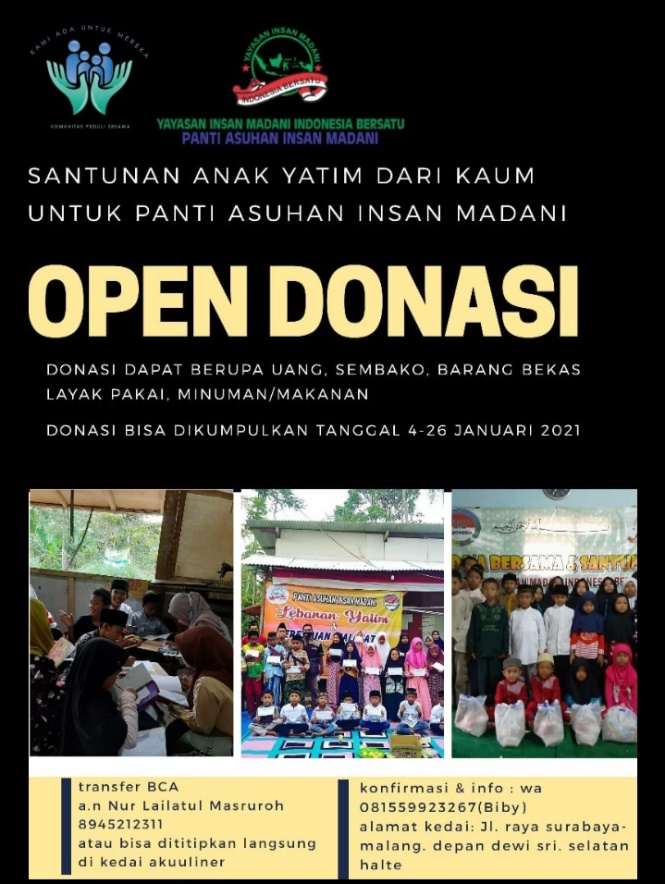 PortalArjuna.Net-Pasuruan, Komunitas KAUM sebar kebaikan dengan mengadakan kegiatan bakti sosial yaitu open donasi untuk membantu anak yatim khususnya Panti Asuhan Insan Madani. Kegiatan ini merupakan program awal yang dilakukan sebagai wujud kepedulian antar sesama manusia, Pengumpulan donasi yang di buka mulai tanggal 4 – 26 Januari 2021. Juma’at(15/01).