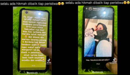Pemilik status WA ini menuliskan “Ya allah masih ingat tadi pagi mohon-mohon lari-lari agar di beri kesempatan naik maskapai penerbangan sriwijaya, meminta kebijakannya biar bisa ikut terbang dan mereka menolak mentah-mentah, dan disana aku merasa kecewa dan balik ke Bandung lagi dalam keadaan sedih, masih ingat muka-muka mereka mengantri tadi pagi check in pesawat. Alah masih memberi kesempatan untukku dan anakku”. Ia mengungkapkan syukur atas keselamatannya karena tidak jadi terbang bersama anaknya.