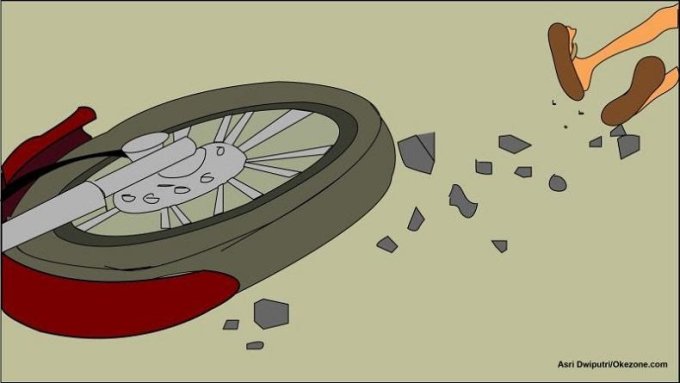 Kronologinya, si korban bersepeda dari arah timur menuju tempat kerjanya, sesampai pertigaan tiba-tiba ada sepeda motor dari arah selatan dengan kelajuan yang cukup tinggi, akhirnya sang korban tarik rem secara mendadak, dan malangnya saat itu dipertigaan jalannya basah sehingga jalanan licin dan menyebabkan jatuhnya si korban.