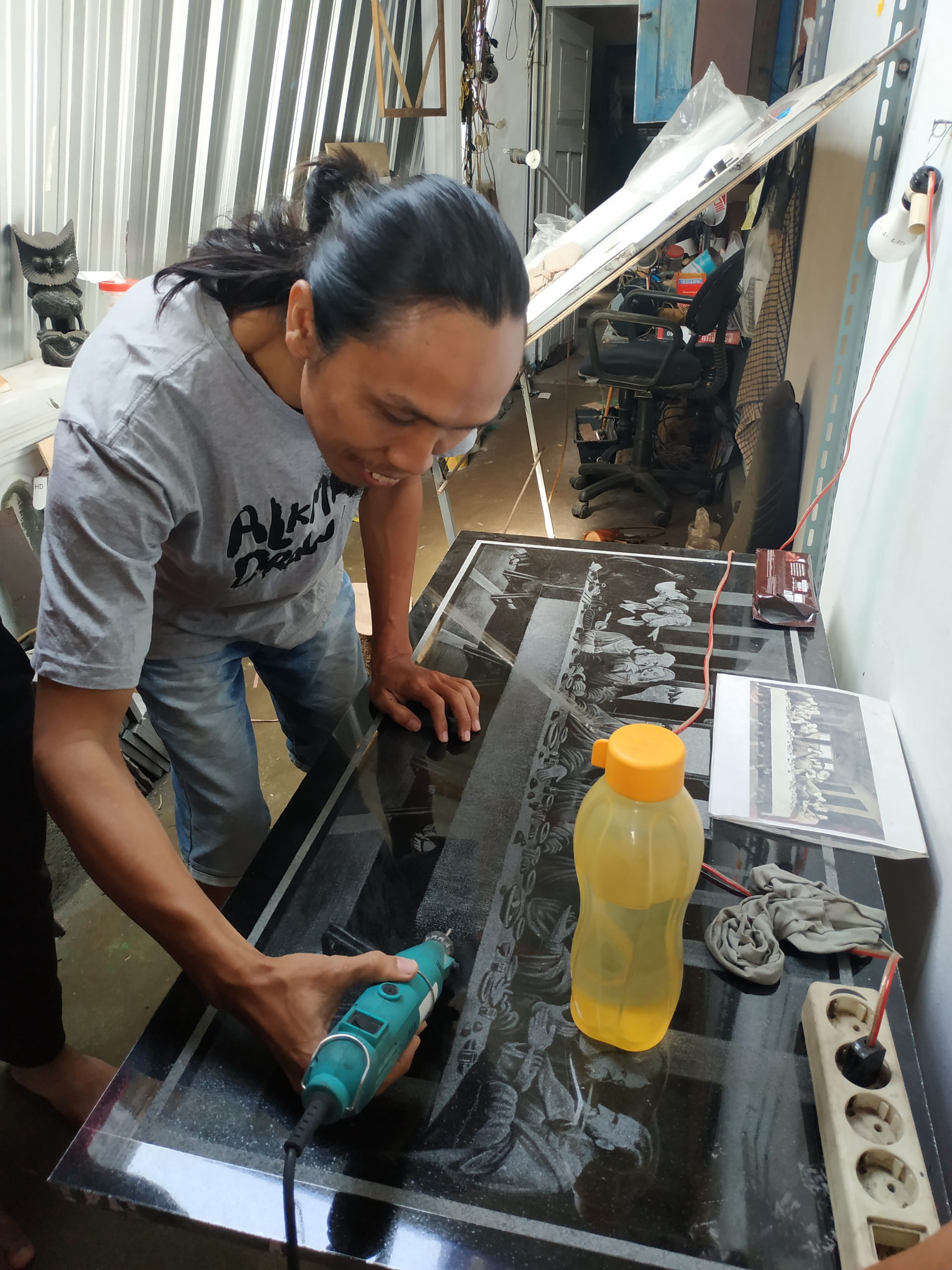 Dengan sentuhan tangannya, sebuah batu granit yang permukaannya berwarna hitam mengkilat dan berbentuk persegi empat, begitu indah disulap menjadi lukisan. Objek berupa foto Close Up di sulap, sangat mirip dengan wajah orang aslinya.