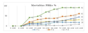 Dari hasil pengamatan efektifitas efikasi formula pestisida nabati daun kecebung gunung dan daun mahoni terhadap mortalitas PBKo terjadi peningkatan mortalitas hama penggerek buah kopi dan formulasi pestisida nabati dengan prosentase mortalitas sebesar 61% yang terkategori hasil positif diatas standar 50 % pestisida alami.