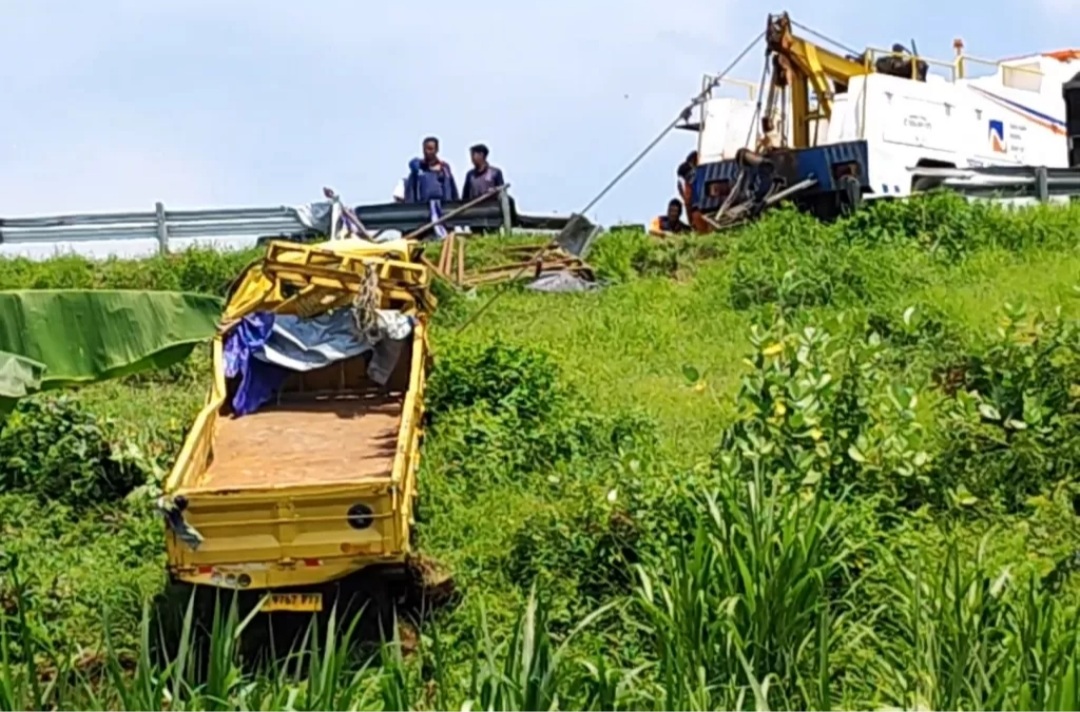 Truk akhirnya menabrak guardrail di sisi kiri jalan hingga jebol dan terjun ke parit sedalam 7 meter di bawah jalan tol. Akibatnya, kabin truk mengalami kerusakan parah, dan sebagian muatan besi tercecer di ruas tol.