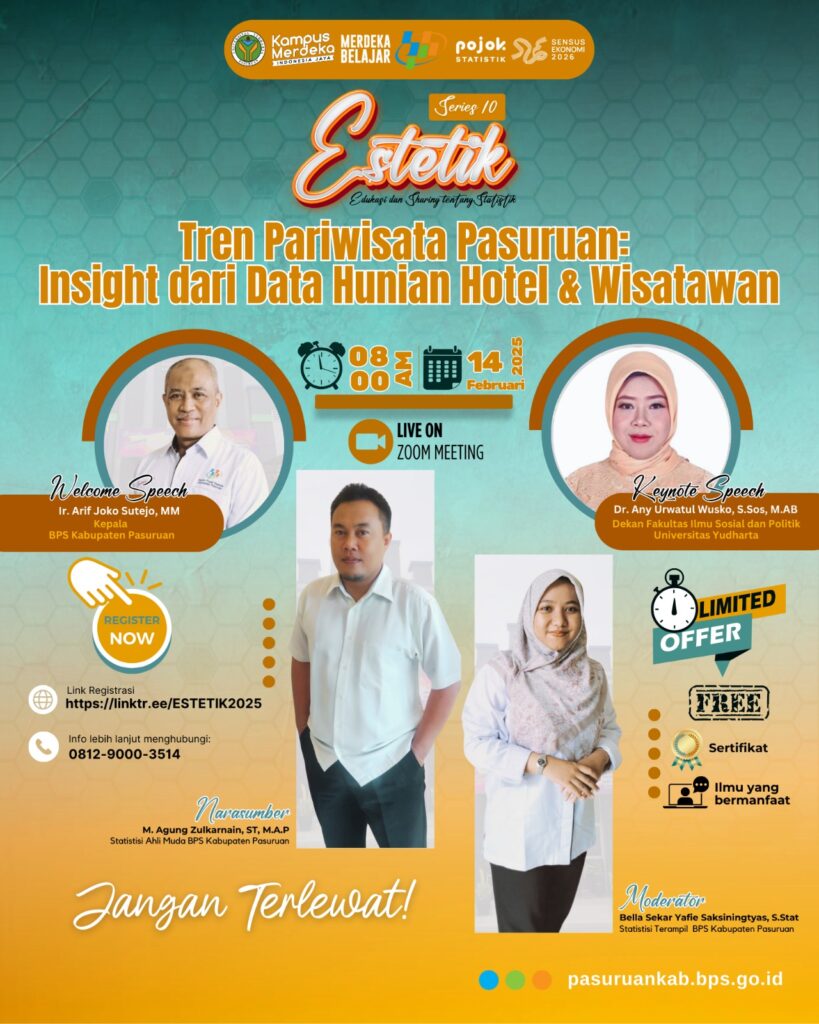 Portalarjuna.net, Pasuruan – Badan Pusat Statistik (BPS) Kabupaten Pasuruan berkolaborasi dengan Universitas Yudharta Pasuruan menyelenggarakan webinar Sharing tentang Statistik (ESTETIK) seri ke-10 bertema “Tren Pariwisata Pasuruan: Insight dari Data Hunian Hotel & Wisatawan”. Kegiatan ini berlangsung pada Jumat, 14 Februari 2025, melalui platform Zoom Meeting dan dihadiri oleh ratusan peserta dari berbagai kalangan, termasuk mahasiswa, […]