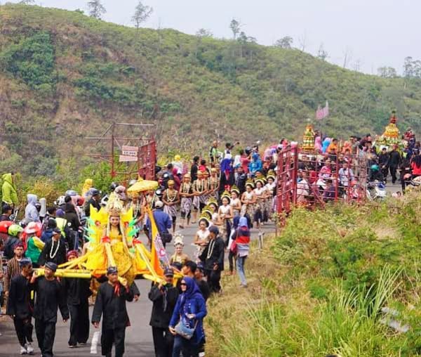Ritual tersebut mulai sekitar pukul 06.00 WIB, sebagai awal acara para sesepuh dan juru kunci Gunung Kelud berangkat dari area parkir menuju kawah, dengan membawa aneka sesaji seperti sekul suci (nasi putih), polo pendhem (umbi-umbian), ayam cemani, ayam Jawa, pisang raja, serta hasil bumi lainnya.”Ayam cemani dan ayam Jawa kami lepas di sekitar kawah. Itu juga menjadi bagian penting dari ritual sebagai simbol pengorbanan dan penyucian alam,” jelas Muthoin.
