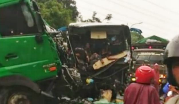 Gambar kedua mobil yang ringsek parah dari arah depan Portalarjuna.net – Lumajang, Kecelakaan antara truk vs bus terjadi di Jalan Raya
