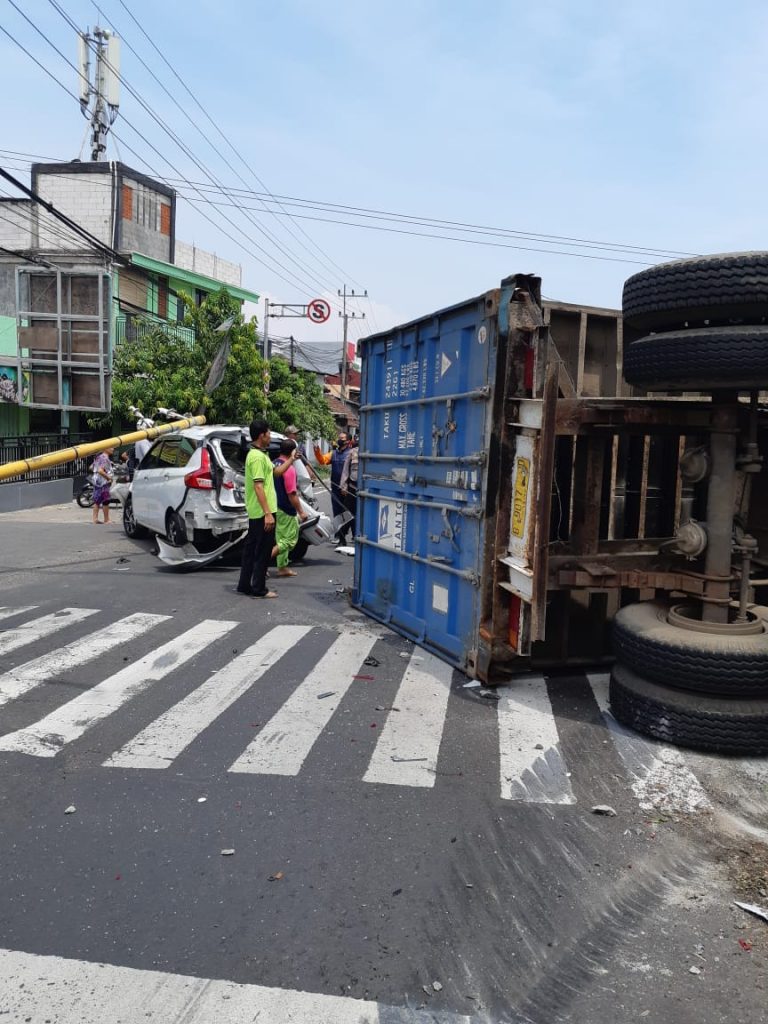 Gambar : Kontainer terguling setelah menabrak mobil Ertiga PortalArjuna.net-Pandaan. Diduga mengalami rem blong, sebuah container hilang kendali dan menabrak mobil ertiga